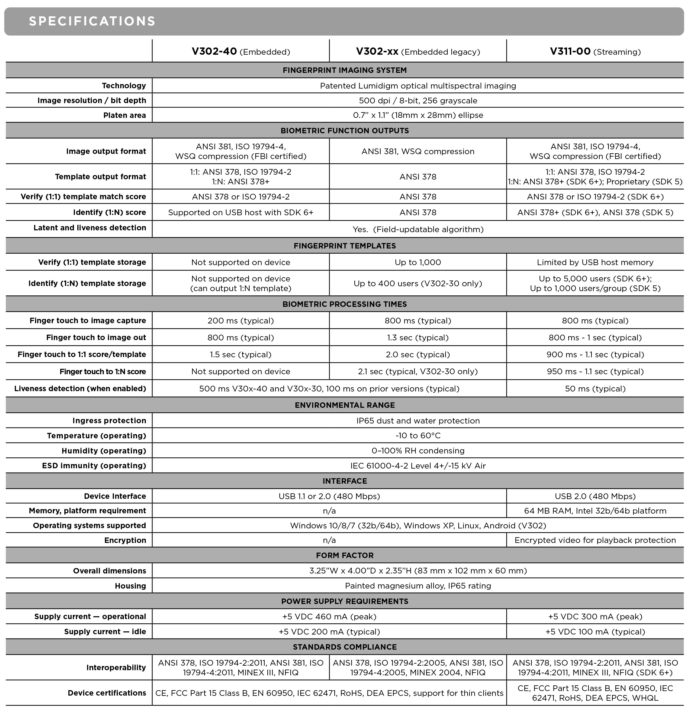 * Best-in-class liveness detection – Prevents the fraudulent use of biometric data by recognizing and rejecting fakes and spoofs. When it has to "just work," look to the Lumidigm V-Series Fingerprint Readers for the performance, reliability and interoperability you need.